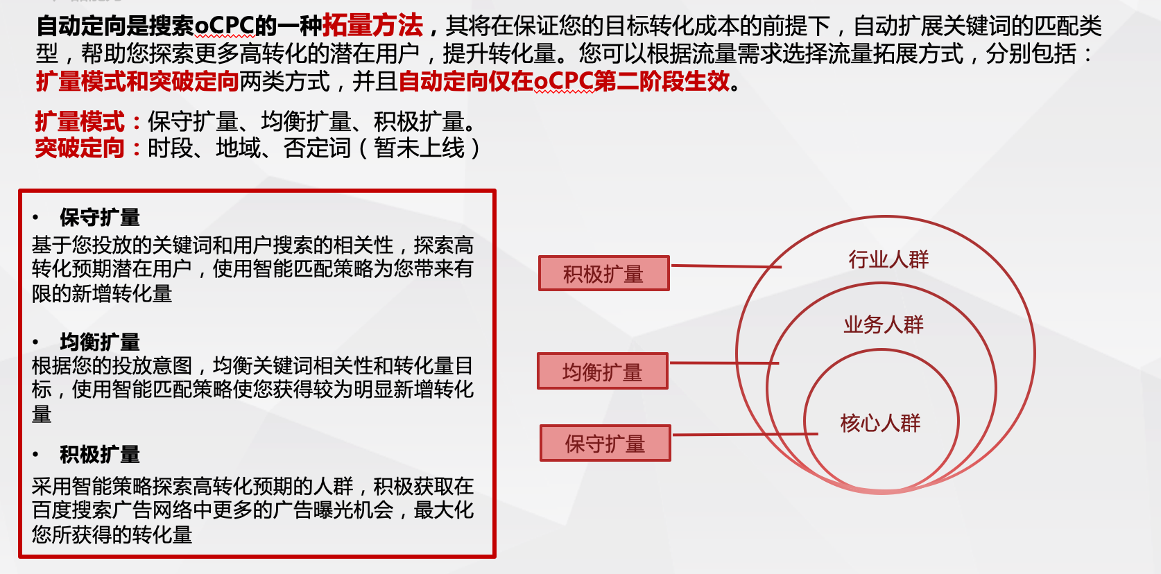 第二步:oCPC會在控制目標成本的基礎上自動幫客戶擴量,擴量時會突破客戶的購買匹配模式,以幫客戶觸發更多的流量,擴量過程中可能會有個別的搜索詞不太相關,但是系統仍會保證整體的目標轉化成本,可以重點關注轉化量和轉化成本指標。