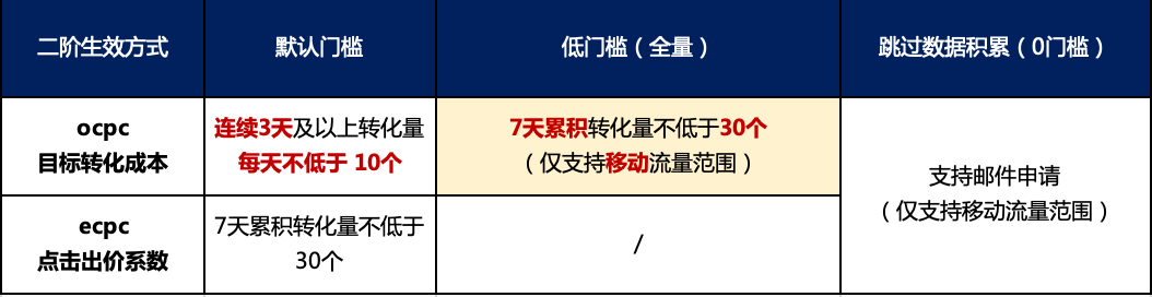 進二階的三個條件:①數(shù)據(jù)核對;②轉(zhuǎn)化數(shù)達到門檻;③CPA設置不低于推薦值的80%。